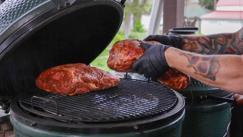 Place the Boston Butt on the grate with the fat side down. While many people debate fat side up versus down, when you are cooking “Turbo” at 350°F, the fat cap acts as a crucial heat shield. Placing it down protects the delicate meat from the direct radiant heat of the ConvEGGtor, ensuring the bottom of your pork doesn’t get tough or scorched while the rest of the roast cooks.