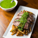 Slice the steak, serve on top of Saltado mixture, and drizzle Chimichurri sauce on top.